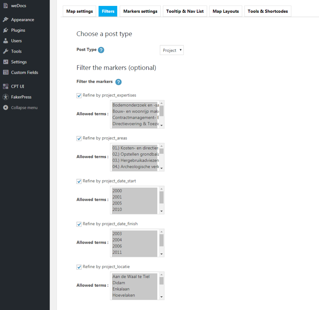 This setting lets you filter the markers received from the post type by choosing which taxonomy terms are allowed.