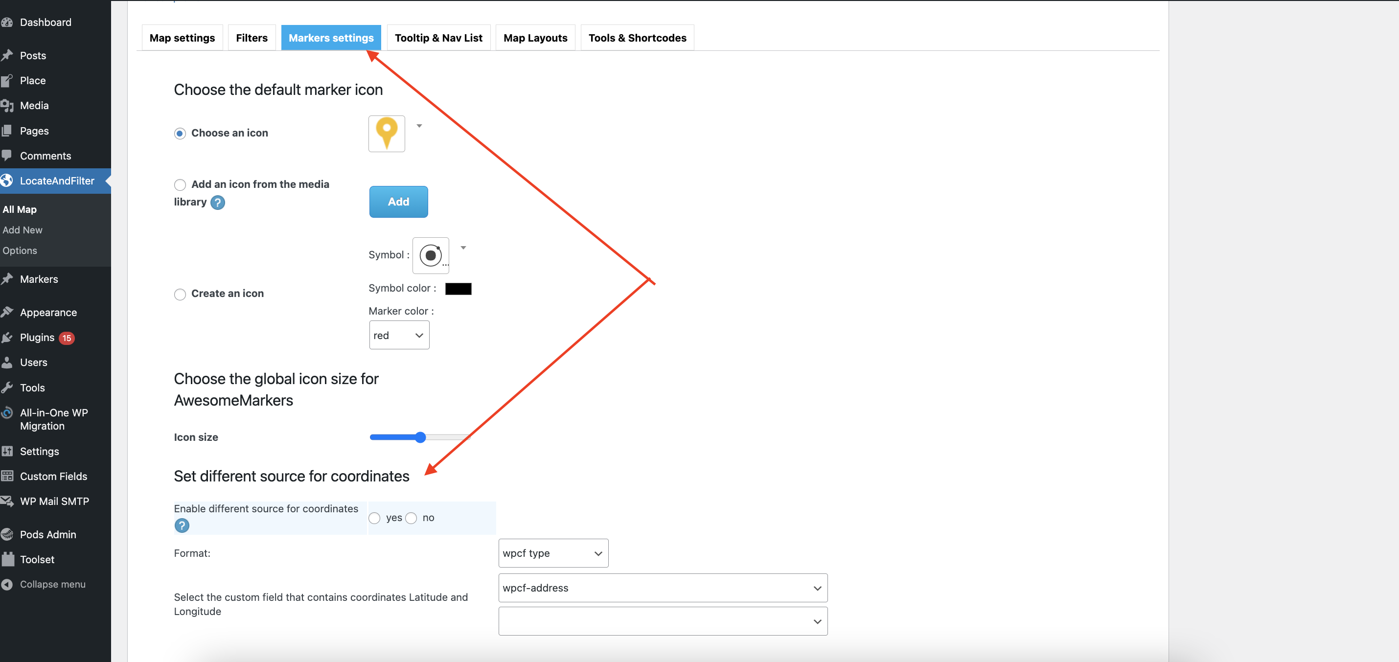 1 on Markers settings will be added new options ‘Set different source for coordinates’