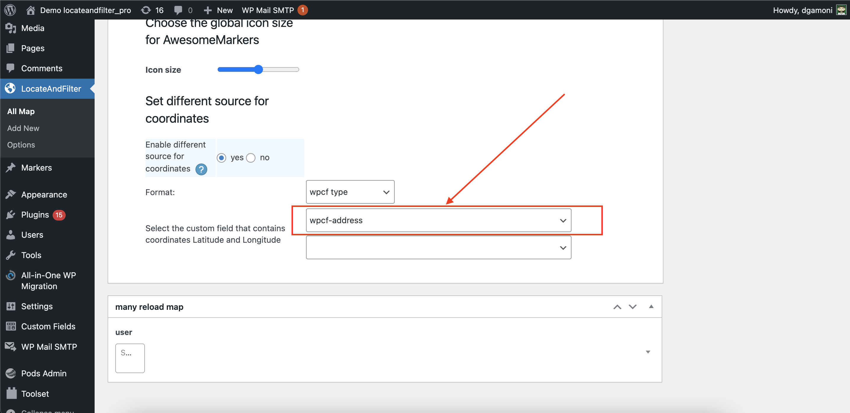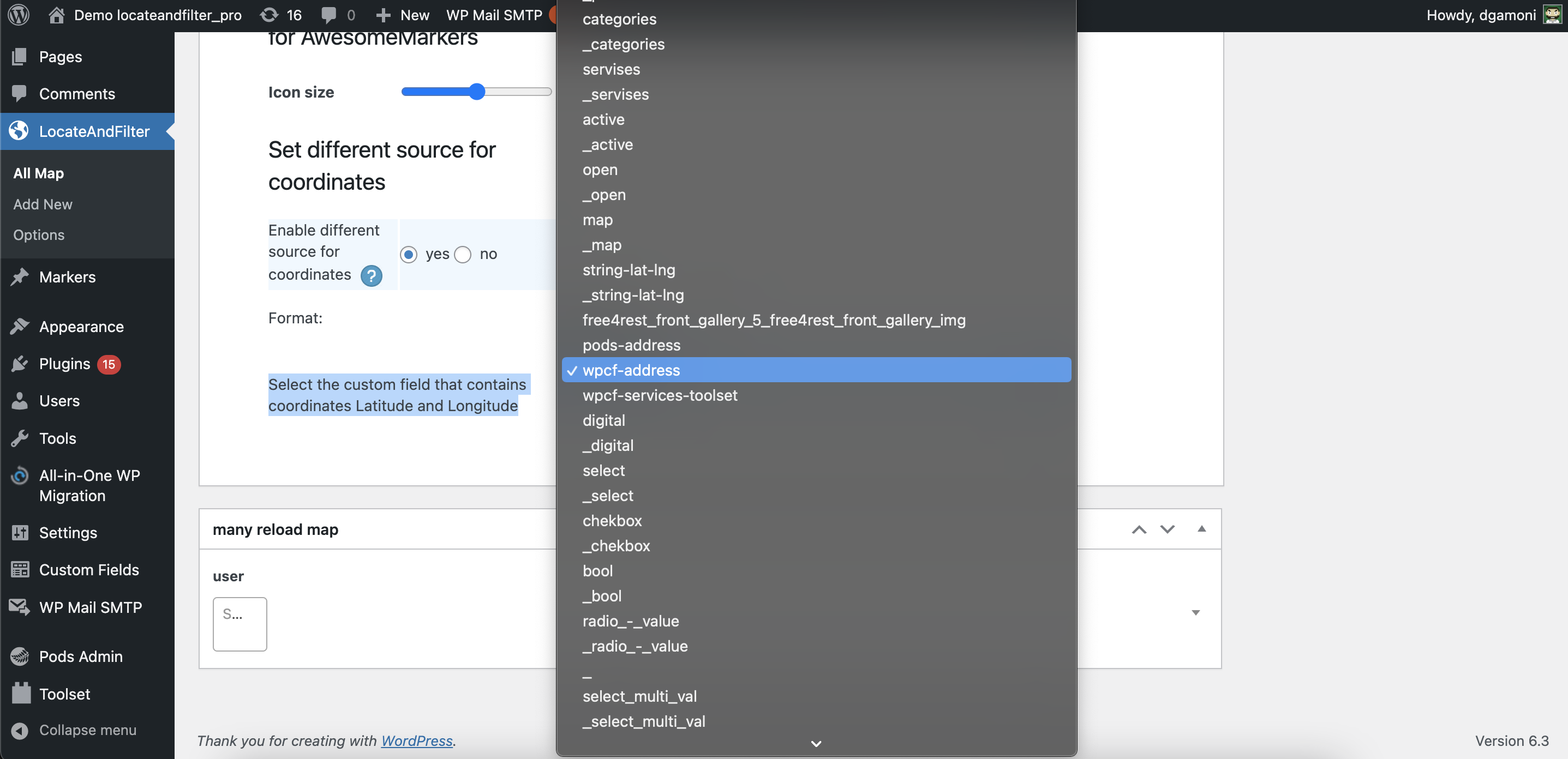2 Select the custom field that contains coordinates Latitude and Longitude