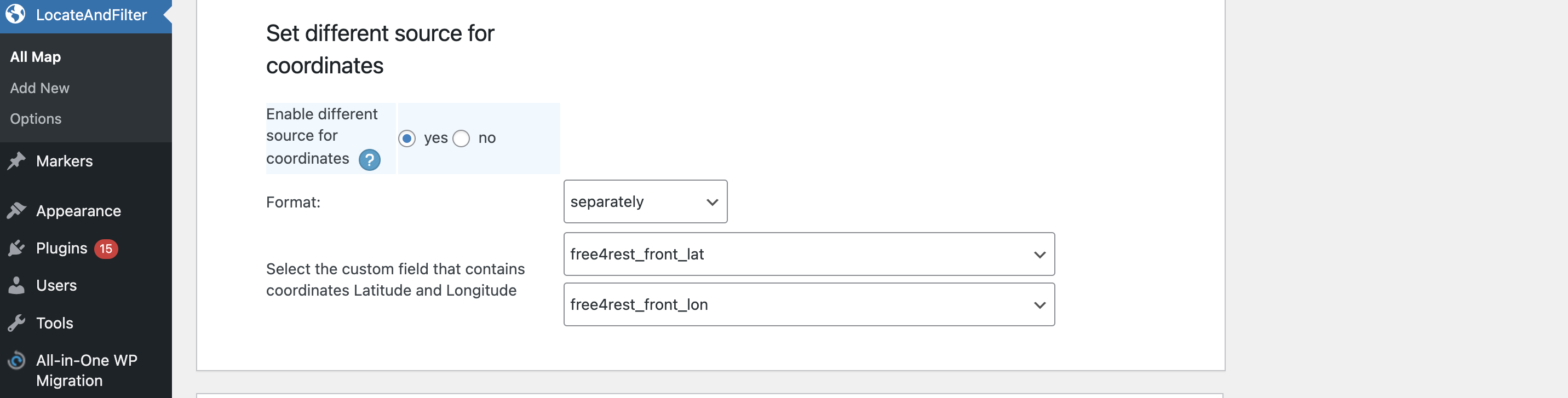 Now you can sets different source for coordinates (Latitude,Longitude) from your custom fields
